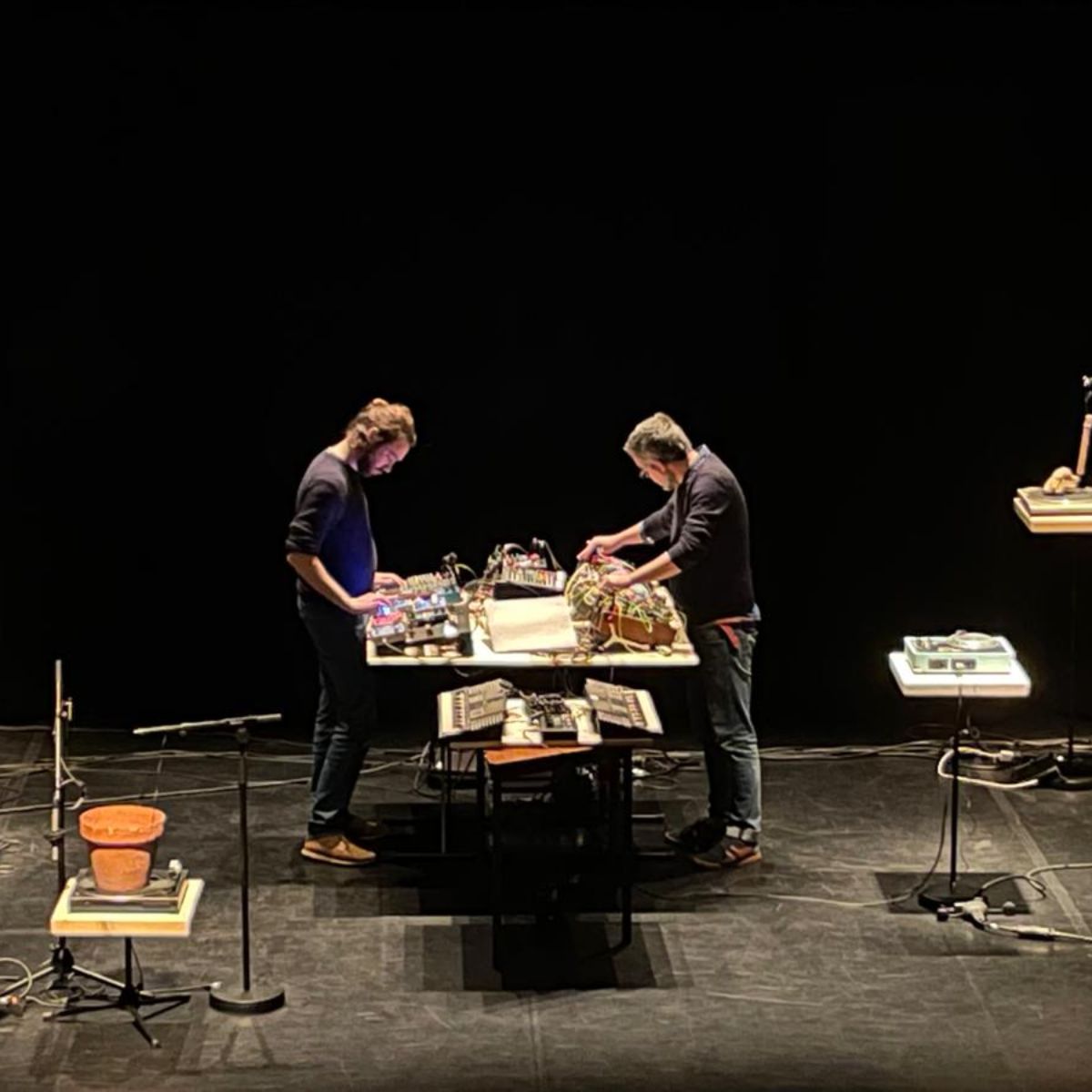 ⥀ est une performance musicale de Perig Villerbu et Thibault Jehanne mêlant platines vinyles, synthèse modulaire et pédales d’effets pour sons concrets.